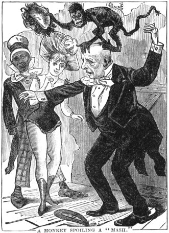 Turning from the human to the zoological branch of the exhibition, we find the usual assortment of animals from the monkey up to Jumbo, the elephant, who is only one of a dozen in the possession of his owner. All performing elephants are well trained, and there is scarcely one that cannot figure in the ring, responding to the good advice of the trainer, as the keepers often style themselves. The monkeys are always a source of599 amusement, and never loose their drawing power. They are intelligent animals, but the inclination they have for mischief makes them quite dangerous. They tell a funny story about an actor out West who had a pet monkey that he carried with him wherever he went, even to the theatre. Jocko appeared to be perfectly harmless, and as he had been at the theatre night after night without making trouble, his master never dreamed that he would do anything out of the way. Imagine his surprise therefore when one night as he was in the midst of a comedy part down came600 Jocko from the "flies" with a false face he had filched out of the property-room. His appearance brought down the house and the play was spoiled.