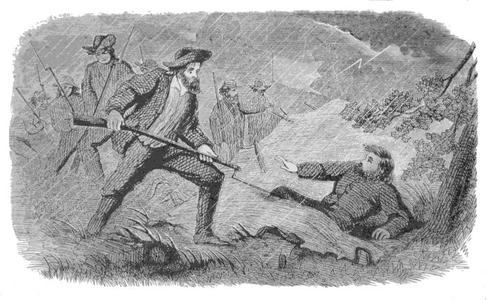 I responded by firing my revolver, as a signal that I did not design to comply with the peremptory demand so euphoniously expressed. The words proceeded from two rebels, whom I discovered approaching me. They fired, and both loads took effect in my horse’s shoulder. But he did not fall. Applying my spurs, he sprang down a little declivity, where the rebels stood with their empty guns. One of them struck at me with his empty weapon. I attempted [Pg 27] to parry the blow with my left hand, and received a severe wound, having my second finger broken, which was thus rendered useless for life. The instant discharge of my revolver resulted in breaking an arm of this foe, and I immediately turned to my second antagonist, who was hastily reloading his gun. The contents of another barrel at once disabled him. This was all the work of a moment. Just at this juncture, it began to rain in torrents; and before I realized my situation, I discovered that I was surrounded by about fifty rebels. The rain and the darkness in the woods, from the overhanging storm-cloud, rendered it difficult for the rebels to distinguish their own men from ours, and they made the mistake—fortunately for me, but the reverse for them—of firing at each other. Their colonel, however, soon discovered the error, and gave the command to cease firing. There was now no possible chance for my escape, and I instantly received a blow which felled me to the earth. How long I remained insensible I could not tell. The first thing I recollect taking cognizance of, was the act of Colonel Gladden, who, dragging me out of a pool of water into which I had fallen, demanded my surrender. I seemed to lose all thought of home, wife, friends, [Pg 28] earth, or heaven. The absorbing thought was the success of our army.