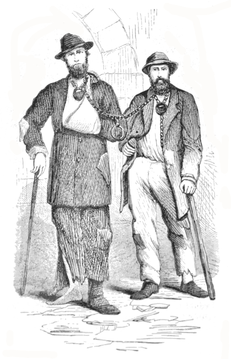 My first act upon landing and reaching Willard’s Hotel, was to secure the services of a photographer, who took myself and comrade with the chain about our necks, and in our rebel rags, exactly as is represented in the engraving. The next important operation was to clean myself, trim my beard and hair, and make myself fit to go into decent society. This was by no means a small undertaking; but by dint of scrub-brushes, soaps of incredible strength, and exercise of muscle to an indefinite extent, I at last succeeded in accomplishing my objects. As I left the bath-room, I noticed at the other [Pg 284] end of the hall, a tall strange gentleman, who, for all I did not recognize him, seemed familiar to me. However, I walked toward him, and he did the same, coming toward me. When I got sufficiently near to address him, I bowed and extended my hand. He did exactly the same. I thought he was behaving very strangely, and with rather a grim smile I drew back and raised myself to my full height. He did exactly the same, and I suddenly discovered that I had been the victim of a huge mirror, and that I had, all the while, been mistaking myself for a clever, gentlemanly-looking old friend of mine. I merely relate this circumstance to prove to the reader, that a man who is unfortunate enough to spend six months in Dixie, is scarcely able to recognize himself upon his return home.