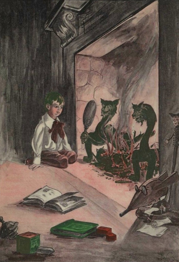 There were many other things in the library beside his heroes that interested Tom. There was a little Japanese ivory god that used to sit up on the mantel shelf and gaze wisely at him, as much as to say, "Dear me, boy, what a lot I could tell you if I only would!" Then, too, there was a very handsome vase on top of one of the book-cases that had two remarkable dragons climbing up its sides, the tail of one of them so fixed that if anyone chose to use the vase for a pitcher the tail would make a very convenient handle, at which the other dragon always appeared to be laughing heartily, which he had no reason to do, because his own tail was not arranged any too gracefully. But the things that, next to Jack the Giant Killer, and Beauty and the Beast, and Tom Thumb and his other heroes[Pg 11] and heroines, Tom liked the most, were two great brazen Andirons that stood in the fireplace. To Tom these Andirons, though up to the night when our story begins he had never seen them move, seemed almost to live. They had big, round, good-natured faces, that shone like so much gold. Their necks were slight and graceful, but as they developed downward toward their handsome feet the Andirons grew more portly, until finally they came to look very much like a pair of amiable sea serpents without much length. Tom's uncle said they looked like cats, with sunflowers for heads, swan necks for bodies, and very little of the cat about them save the claws. This description made Tom laugh, but the more he thought about it the more truthful did it seem to him to be.