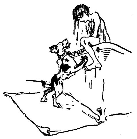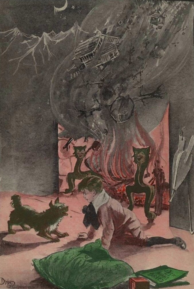 Tom sat up and rubbed them, for there was no snow, no avalanche, no Alp, no St. Bernard dog in sight. Only a friendly pair of andirons staring fixedly at him out of the fireplace of his father's library: the poker standing like a grenadier at one side, and the bellows, hanging from a brass-headed nail on the other. Beside these, lying on the rug beside him, his head cocked to one side, his eyes fixed intently upon Tom's face, and his tail wagging furiously, was Jeffy, not a St Bernard, but a shaggy little Scotch terrier.