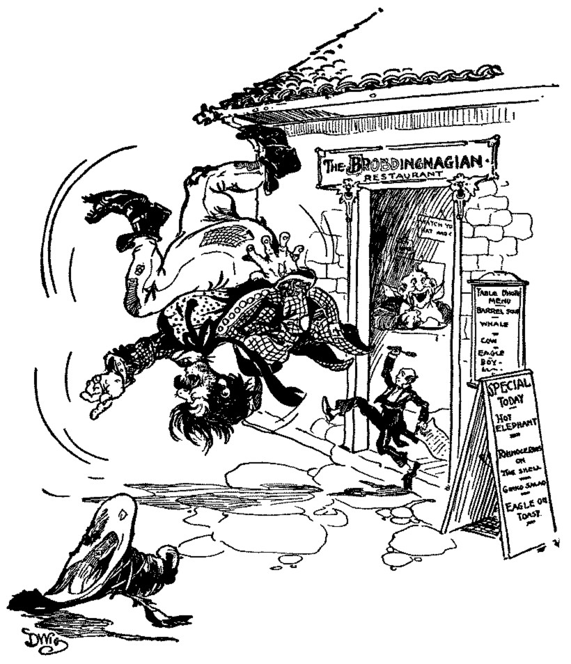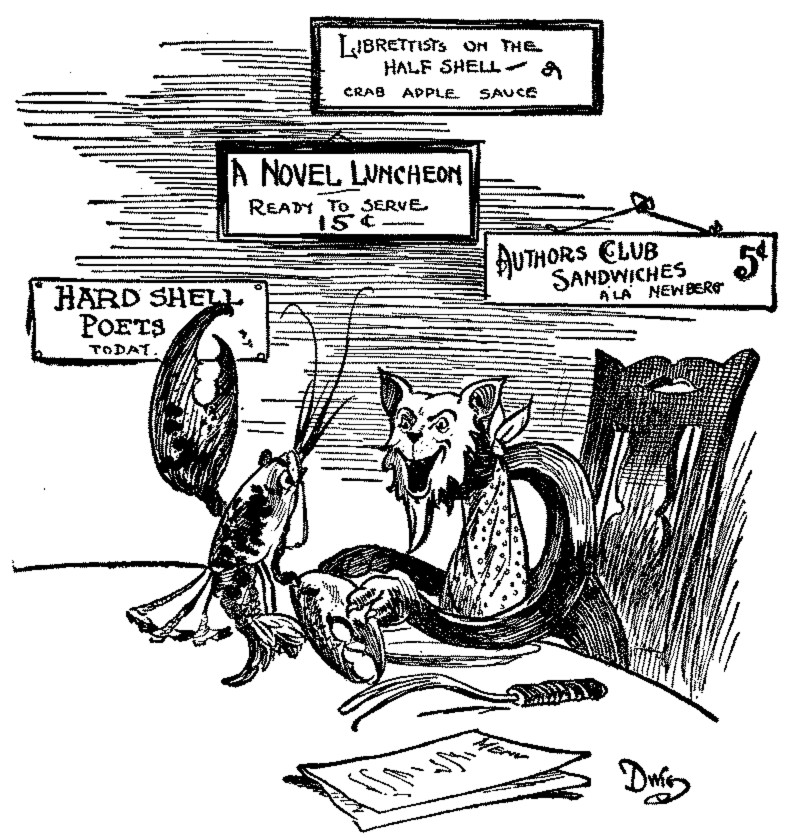 "Purely intellectual, if you know what that means," said the Bellows. "You get your mind filled there instead of your stomach. You meet the wittiest oysters, and the most poetic clams, and the most literary lobsters at the Lobster shop you ever saw. For my part I love the Lobster shop. I can get something to eat anywhere. I can get a stake at any lumber yard in town. I can get a chop at any ax factory in the country, and if I want sweets I can find a Cakery—"