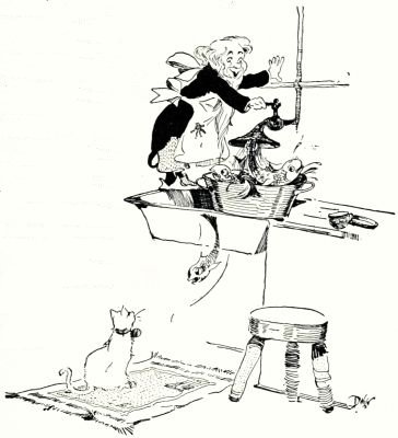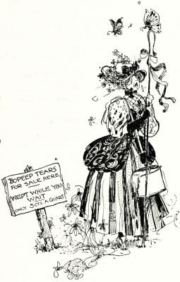 "I have to," replied Bopeep. "That's part of my business, too. I sometimes wish old Mother Goose hadn't employed me to look after the sheep at all, because it keeps me crying all the time, and I don't find crying very pleasant. Why, do you know, I have been in this sheep-losing business for nearly[Pg 18] two hundred years now, and I've cried about seventy gallons of tears every year. Just think of that. That means fourteen thousand gallons of tears, and I only get five cents a quart, which doesn't more than pay my dressmaker's bills. I asked my employers some years ago to let me have an assistant to do the crying for me, but they wouldn't do it, which I think was very mean, don't you?"