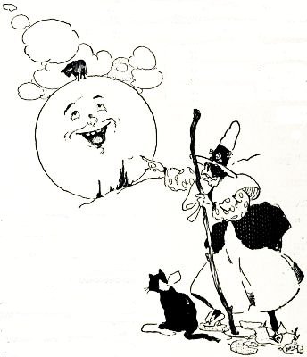 "Yes," said the little old woman, with a frown which frightened poor Whistlebinkie so that he gasped and whistled softly in spite of his efforts to keep quiet. "Yes,[Pg 25] I've seen your sheep. I know just where they are, too. One of 'em's gone to the moon. Another has been adopted by a girl named Mary, who is going to take it to school and make the children laugh. Another has sold his wool to a city merchant, and the fourth has accepted an invitation to dinner from a member of Congress. He will reach the dinner at half-past seven to-night on a silver platter. He will be decorated with green peas and mint sauce. Now get along with you."