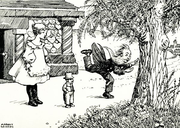 "The Unwiseman. He's an unwiseman who doesn't know anything," explained Bopeep. "The rules require that we go to him[Pg 19] first and ask him if he knows where the sheep are. He'll say he doesn't know, and then we'll go on to the little old woman who lives under the hill. She'll know where they are, but she'll tell us wrong. Hi! Whistlebinkie and Flaxilocks! Turn off to the left, and stop at that little red house under the oak tree."