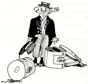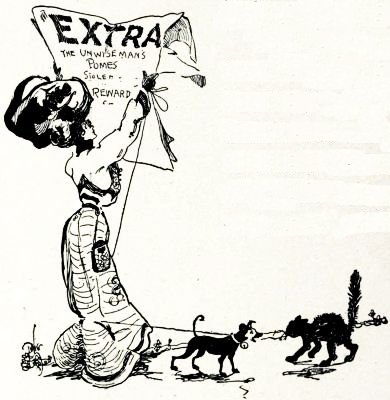 "Maybe I do," observed the Unwiseman. "But I thought the word was snatchel, because it was a thing you could snatch up hurriedly and run to catch a train with. Anyhow, I made one and put some four or five pounds of potery in it, and started out to sell it. The first place I went to they said[Pg 191] they liked my potery very much, but they couldn't use it because it didn't advertise anything. They wanted sonnets about the best kind of soap that ever was; or what they called a hook-and-eye lyric; or perhaps a few quatrains about baking-powders, or tooth-wash, or some kind of silver-polish. People don't read poems about mysteries and little red school-houses, and patriotism any more, they said; but if a real poet should write about a new kind of a clothes-wringer or a patent pickle he'd make a fortune, because he'd get his work published on fences and in railroad cars, which everybody sees, instead of in magazines that nobody reads."