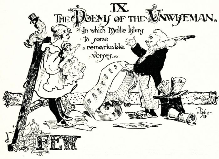 Mollie and Whistlebinkie and Gyp went silently home, very unhappy about the Unwiseman's temper, but, though they did not know it, they were very fortunate to get away before the Unwiseman discovered that the mischievous Gyp had chewed up three[Pg 172] pounds of sonnets while their author was reading his poem "Night," so that on the whole, I think, they were to be congratulated that things turned out as they did.
