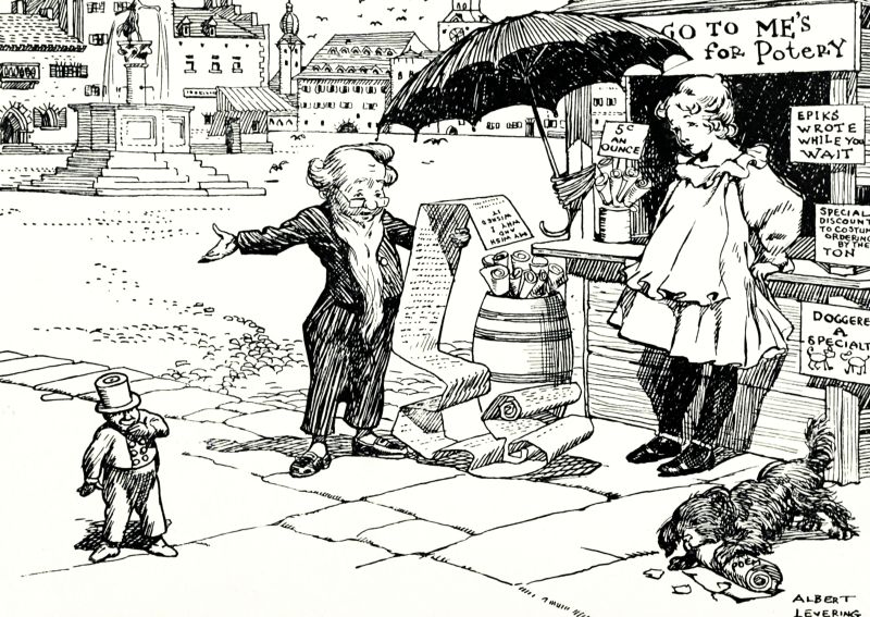 "Not I!" retorted the Unwiseman, scornfully. "No, indeed, I'm not. Shakespeare[Pg 192] never did such a thing, and I don't believe Milton did either, and certainly I shall not try it. The next place I went to they said they liked my potery well enough to print it, but I'd have to pay for having it done, which was very hard, because I hadn't any money. The next place they took a sonnet and said they'd pay for it when they published it, and when I asked when that would be, they said in about thirty-seven years."