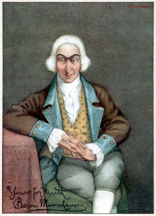 In order that there may be no misunderstanding as to the why and the wherefore of this collection of tales it appears to me to be desirable that I should at the outset state my reasons for acting as the medium between the spirit of the late Baron Munchausen and the reading public. In common with a large number of other great men in history Baron Munchausen has suffered because he is not understood. I have observed with wondering surprise the steady and constant growth of the idea that Baron Munchausen was not a man of truth; that his statements of fact were untrustworthy, and that as a realist he had no standing whatsoever. Just how this misconception of the man’s character has arisen it would be difficult to say. Surely in his published writings he shows that same lofty resolve to be true to life as he has seen it that characterises the work of some of the high Apostles of Realism, who are writing of the things that will teach future generations how we of to-day ordered our goings-on. The note of veracity in Baron Munchausen’s early literary venturings rings as clear and as true certainly as the similar note in the charming studies of Manx Realism that have come to us of late years from the pen of Mr. Corridor Walkingstick, of Gloomster Abbey and London. We all remember the glow of satisfaction with which we read Mr. Walkingstick’s great story of the love of the clergyman, John Stress, for the charming little heroine, Glory Partridge. Here was something at last that rang true. The picture was painted in the boldest of colours, and, regardless of consequences to himself, Mr. Walkingstick dared to be real when he might have given rein to his imagination. Mr. Walkingstick was, thereupon, lifted up by popular favour to the level of an apostle—nay, he even admitted the soft impeachment—and now as a moral teacher he is without a rival in the world of literature. Yet the same age that accepts this man as a moral teacher, rejects Baron Munchausen, who, in different manner perhaps, presented to the world as true and life-like a picture of the conditions of his day as that given to us by Mr. Walkingstick in his deservedly popular romance, “Episcopalians I have Met.” Of course, I do not claim that Baron Munchausen’s stories in bulk or in specified instances, have the literary vigour that is so marked a quality of the latter-day writer, but the point I do wish to urge is that to accept the one as a veracious chronicler of his time and to reject the other as one who indulges his pen in all sorts of grotesque vagaries, without proper regard for the facts, is a great injustice to the man of other times. The question arises, why is this? How has this wrong upon the worthy realist of the eighteenth century been perpetrated? Is it an intentional or an unwitting wrong? I prefer to believe that it is based upon ignorance of the Baron’s true quality, due to the fact that his works are rarely to be found within the reach of the public: in some cases, because of the failure of librarians to comprehend his real motives, his narratives are excluded from Public and Sunday-School libraries; and because of their extreme age, they are not easily again brought into vogue. I have, therefore, accepted the office of intermediary between the Baron and the readers of the present day, in order that his later work, which, while it shows to a marked degree the decadence of his literary powers, may yet serve to demonstrate to the readers of my own time how favourably he compares with some of the literary idols of to-day, in the simple matter of fidelity to fact. If these stories which follow shall serve to rehabilitate Baron Munchausen as a lover and practitioner of the arts of Truth, I shall not have made the sacrifice of my time in vain. If they fail of this purpose I shall still have the satisfaction of knowing that I have tried to render a service to an honest and defenceless man.