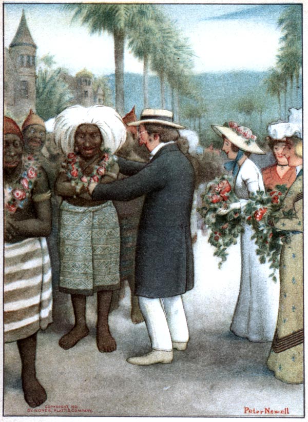 “Oh, we got rid of ’em next season all right,” said Mr. Munchausen. “I invented a scheme that kept them away all the following summer. I got the landlord to hang calendars all over the house with one full page for each month. Then in every room we exposed the page for May and left it that way all summer. When the June-bugs arrived and saw these, they were fooled into believing that June hadn’t come yet, and off they flew to wait. They are very inconsiderate of other people’s comfort,” Mr. Munchausen concluded, “but they are rigorously bound by an etiquette of their own. A self-respecting June-bug would no more appear until the June-bug season is regularly open than a gentleman of high society would go to a five o’clock tea munching fresh-roasted peanuts. And by the way, that reminds me I happen to have a bag of peanuts right here in my pocket.”