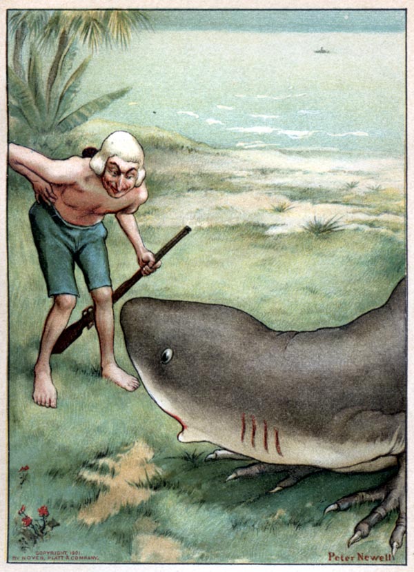 “No,” said Mr. Munchausen, “it wasn’t that way at all. It saved my life when I was attacked by a fierce and ravenously hungry lion. If I hadn’t known how to play golf it would have been farewell forever to Mr. Munchausen, and Mr. Lion would have had a fine luncheon that day, at which I should have been the turkey and cranberry sauce and mince pie all rolled into one.”