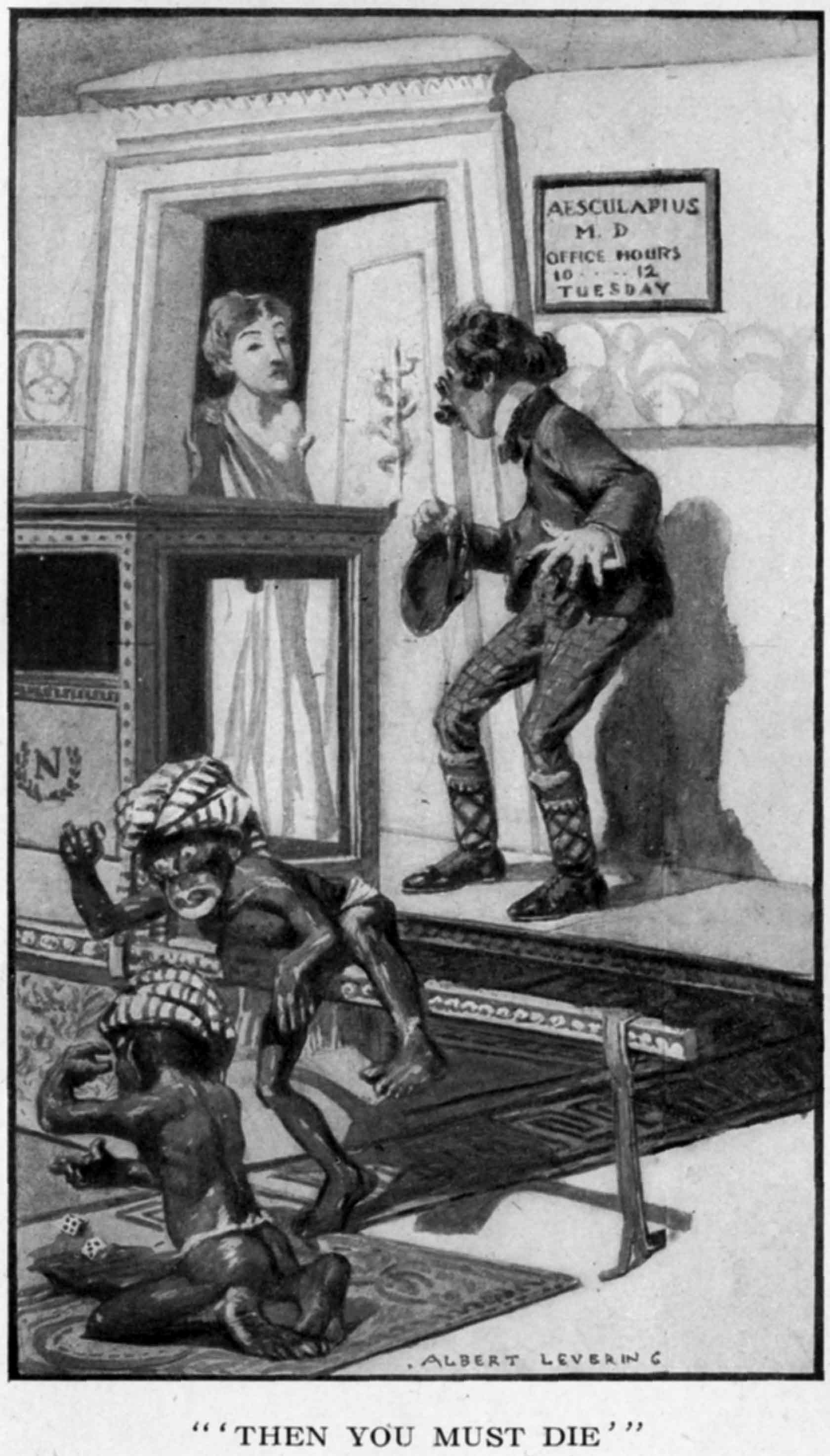 "To the office of Dr. Æsculapius!" he commanded, and I was unceremoniously removed to the room wherein I had had my interview with the great doctor, where I was immediately etherized and my brain operated upon. Precisely what was done to me I shall probably never know, but what I do know is that[Pg 223] from that time to this all that I saw in that marvellous Futuroscope is a blank, although on all other subjects pertaining to my visit to the gods my recollection is perfectly clear. It suffices to say that I lay for a long time in a stupor, and when finally I came to my senses again I found myself comfortably ensconced in my own bed, in my own home; not in Greece, but in America; suffering from a dull headache from which I did not escape for at least three hours. Again and again and again have I tried to recall that wonderful picture of a marvellous future seen by my mortal eyes that night upon Olympus, that I might set it upon paper for others to read, but with each effort the dreadful pain in the top of my head returns and I find myself compelled to abandon the project.