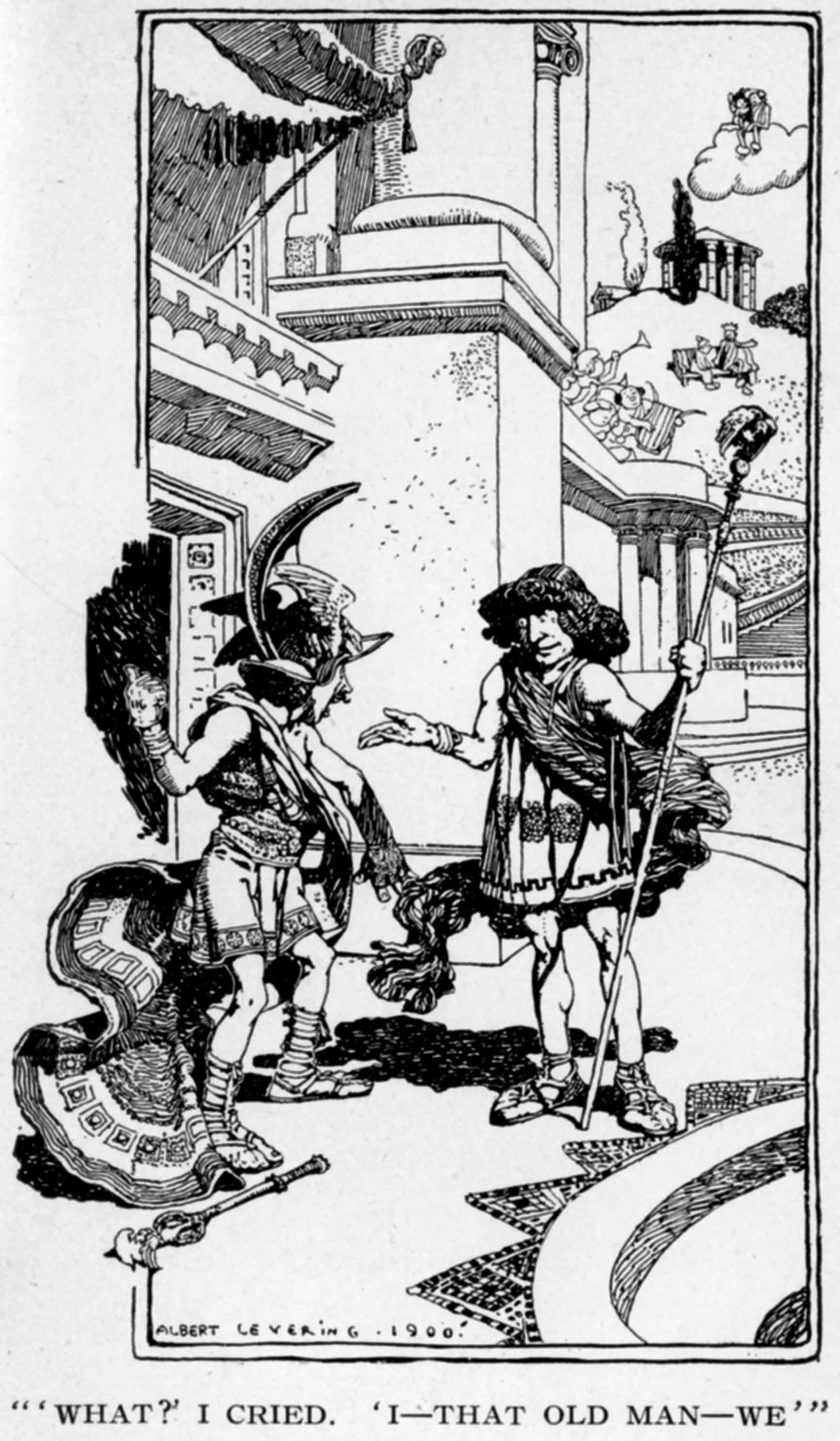 "The more exalted one's position, the greater the sartorial obligation," retorted Hippopopolis, who, for a Greek and a guide, had, as will be seen, a vocabulary of most remarkable range. "Just as it happens that our King here, like H. R. H. the Prince of Wales, has to be provided with seven hundred and sixty-eight suits of clothes so as to be properly clad at the variety of functions he is required to grace, so does a god have to be provided with a wardrobe of rare quality and extent. For drawing-room tables,[Pg 12] mantel-pieces, and pedestals, otherwise for statuary, Mercury can go about clad in just about half as much stuff as it would require to cover a fairly sized sofa-cushion and not arouse drastic criticism; but when he goes to business he is as well provided with pockets as any other speculator."
