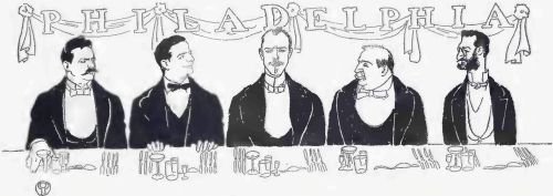 "A superb city, considering its recency, as you say in English. I met many delightful people there. Senator Tom Reed received me at his palace on Euclid Avenue, if I remember the street aright; the Mayor of the city, Mr. McKinley, gave me a dinner, at which I sat down with Mr. Cleveland and Mr. Van Wyck, and Mr. Bryan and Mr. Pulitzer, and other members of his cabinet; and in my leisure hours I found the theatres of Philadelphia most pleasing, with Mr. Jefferson singing his nigger songs, Mr. Mansfield in his inimitable skirt-dancing, and, best of all, Mr. Daly's Shakespearian revivals of 'Hamlet' and 'Othello,' with Miss Rehan in the title-rôles. Oh yes, Miss Witherdown—"