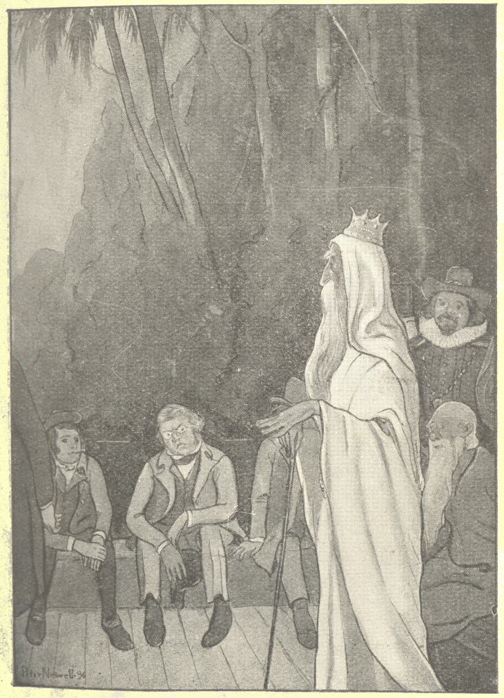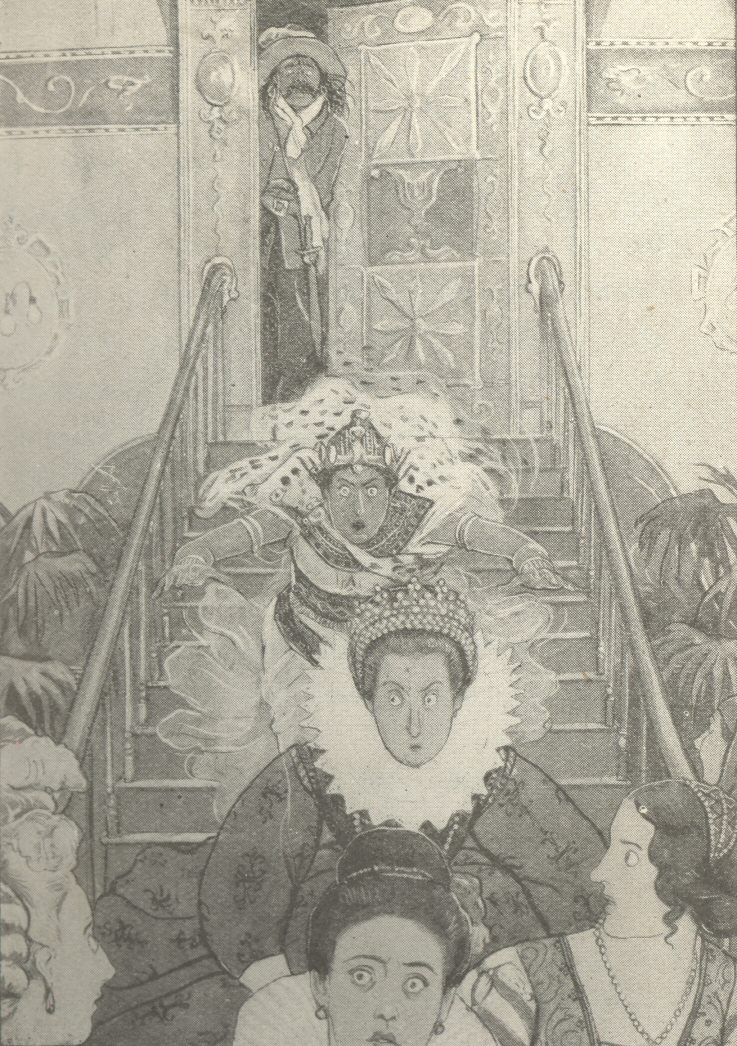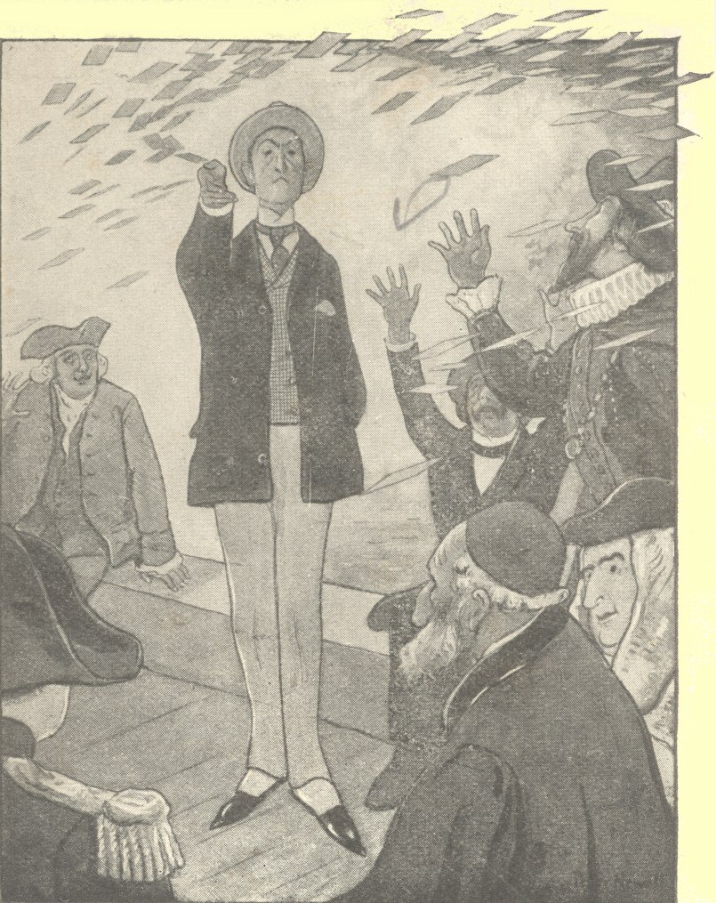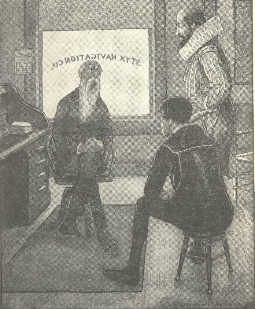 “I can’t stand it!” cried Raleigh, desperately, as with his accustomed grace he presided over a special meeting of the club, called on the bank of the inky Stygian stream, at the point where the missing boat had been moored. “Think of it, gentlemen, Elizabeth of England, Calpurnia of Rome, Ophelia of Denmark, and every precious jewel in our social diadem gone, vanished completely; and with whom? Kidd, of all men in the universe! Kidd, the pirate, the ruffian—”