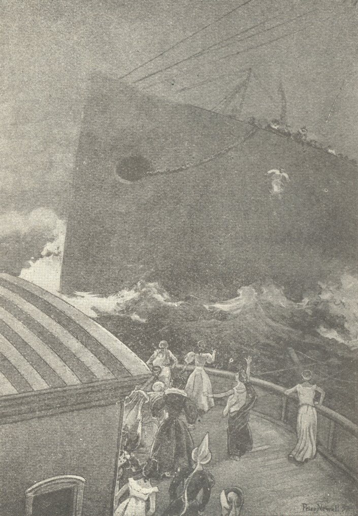 A terrible crash interrupted the old lady’s remarks. The House-boat shivered and shook, careened way to one side, and as quickly righted and stood still. A mad rush up the gangway followed, and in a moment a hundred and eighty-three pale-faced, trembling women stood upon the deck, gazing with horror at a great helpless hulk ten feet to the rear, fastened by broken ropes and odd pieces of rigging to the stern-posts of the House-boat, sinking slowly but surely into the sea.