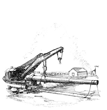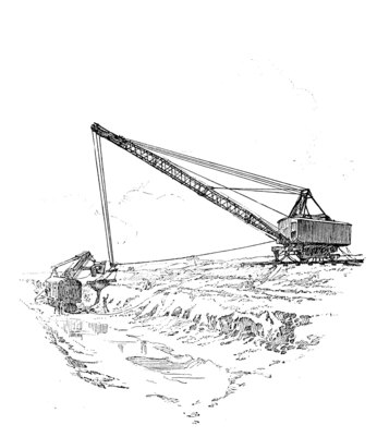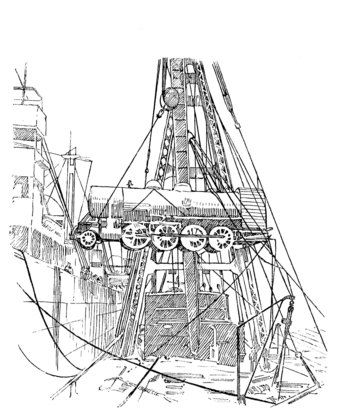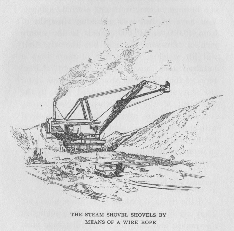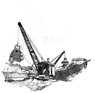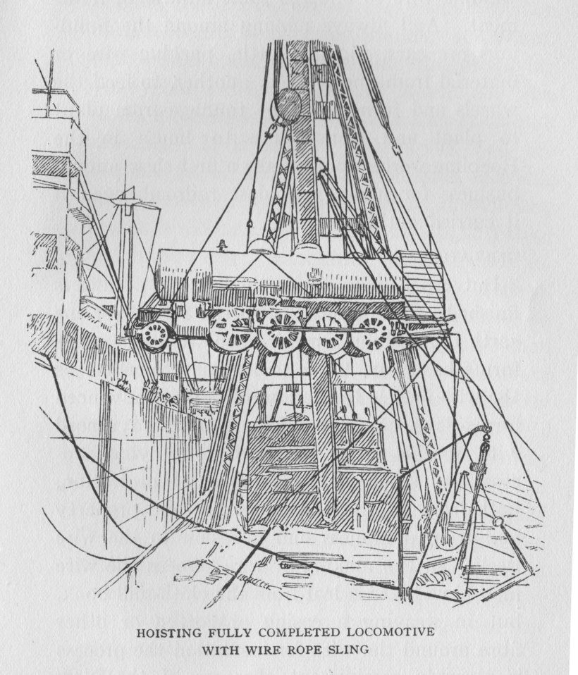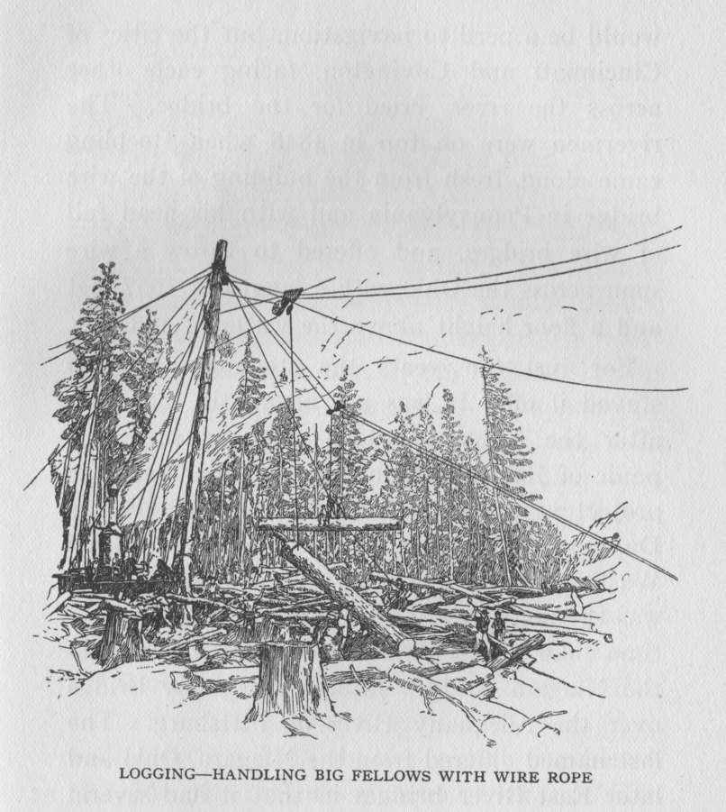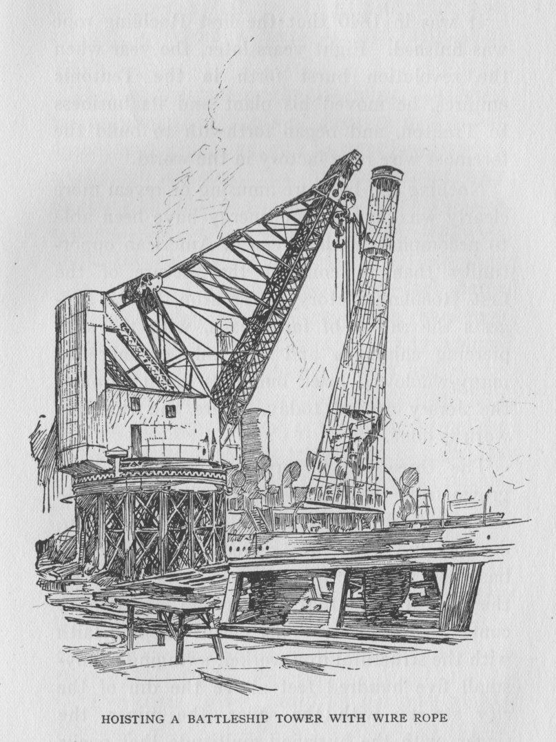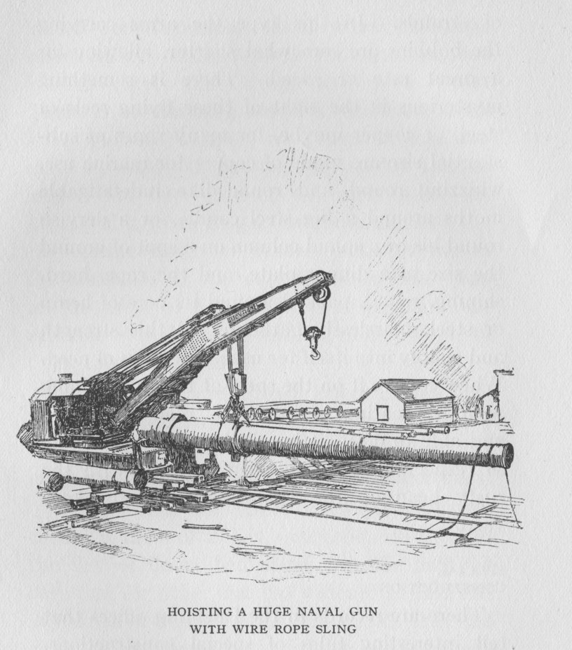 There is the transmission of power by means of a round, endless rope, running at high velocity over a series of sheaves or pulleys, carrying power to a distance of three miles; there is underground haulage, for which five distinct types of rope are used, enabling the engineer to make light of grades, even with staggering loads; logging, in which, in the primeval forests of the Northwest, the horse or ox is a pigmy, and where the giant trunks, seven, eight or nine feet in diameter, are whisked up at the sides of mountains, hoisted into the air and deposited on cars, to be run down to the rivers on steep inclines, again operated by rope of great size and strength. There is quarrying, where rope is used in quantity for guying, and for hoisting the blocks of stone out of their beds, and then on aerial cable ways, to carry them on high over long distances to be loaded; there are the oil fields, in which just now, in the mad search for petroleum to supply the world’s shortage, interminable miles of wire rope are being used, some of it an inch thick or over, to carry the drills, or for casing and sand lines. There is shipping—the battleship and the merchantman and the liner; the yacht, the riverman and the tug—all strung with wire rope from stem to stern, and some of them from truck to keel as well—not to mention mooring lines which have their own plan and formula; there is towing, to which wire rope brought new possibilities and freedom from old troubles and old perils—witness the towing of the dry dock “Dewey” from Chesapeake Bay to the Philippines, thirteen thousand miles, on a pair of 1200 foot Roebling hawsers, which stuck to their jobs without interruption, through all sorts of weather, and lugged their burden into the harbor of Olongapo without a sign of weakness or exhaustion; there is dredging, for which wire rope has largely supplanted the old and cumbrous chain which was never any stronger than its weakest link. There is hardly an important harbor in the world today where these stout ropes are not busy clearing pathway and anchorage for marine commerce.
