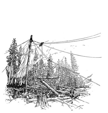 Persistently militant, from the day of his first achievement, in the promotion of wire rope, John A. Roebling was the first engineer to introduce into America the novelty of a wire cableway, which with an ingenious carriage he employed to transport across a river the materials he needed in the construction of a bridge. This method of haulage, over streams and gorges, down from high mountains to cars or boats in the valley below, up from the deep-sunken beds of rich placers—everywhere and in all sorts of places where Nature seemed to have set up impassable defense against those who would take away her treasures—came forthwith into widespread use, and is among the handy tools of engineers throughout the world today. The Roebling Company established these cableways in many countries. It had in operation around the globe no less than twenty different types, including log rigs and gravity planes for mountain railways, and the demand for wire rope was increased thereby a thousand fold before the new century had come in.