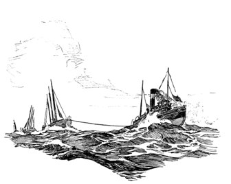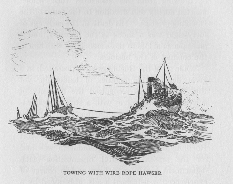 When the mechanism is at work it suggests somehow the solar rotations. The bobbins have a triple motion. On the ends of the arms to which they are attached they travel around the column, at a rate of speed which of course is determined by the “lay” required, but they are unwinding as the strand pays out and also turn completely end for end, at predetermined intervals. In the more modern machines there are two sets of arms or “branches” above the first, for the purpose of carrying a greater number of strands. In this type the arms carrying the bobbins are somewhat shorter, allowing for a great rate of speed. There is something mysterious in the sight of these flying reels of steel, or copper maybe, for many ropes of substantial size are made of copper for marine use, whizzing round and round like indefatigable moths around a big steel candle, or a dervish round his own spinal column on a spot of ground the size of a dinner plate, and the rope, hard, shining, round, packed around its core of hemp or steel, noiselessly gathering all this strength and energy into itself for use in the days of need. When you see it on the spool at the side, shining with its coating of lubricant, ready for work and able to do it, it is a little hard to associate so respectable and dignified a fabric with the rusty heap of iron that lay in the Kinkora yard.