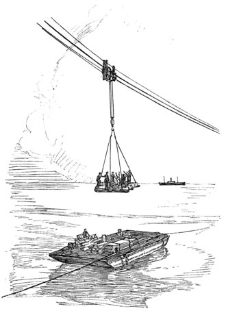 Next, suspending the river traffic for the necessary time, the scow was towed across the river, paying out as she went, and the rope carried over the New York tower, then wound on a huge drum till it hung high above the river and clear of the tallest topgallant. A second rope was run in the same manner and the two were joined around huge driving wheels or pulleys at each end. An endless belt or “traveler,” revolving by steam power, now stretched from city to city, and on a day in August, that lives yet in the memory of every man who was there, E. F. Farrington, the master mechanic of the project, who was a veteran of Niagara and the Ohio Bridge, set out to show the workmen, who on this slender aerial were to begin the long labor of hanging the cable, that it was easy if you only thought so. In a “bosun’s chair” he shot out from the top of the Brooklyn tower, down the long sag in the traveler and up to the New York side, while a million people craned their necks from the streets and docks and housetops and boats along the river, and swallowed hard at their hearts.