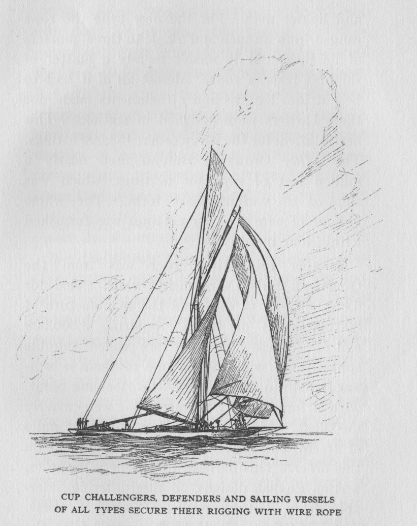 Of the tricks in making ropes, there is no end. They are fitted for their work like a soldier or a gymnast, and built for it. A tiller rope must be flexible to the last degree, but it must be strong enough so it will stand up under the swift tensions of a storm or in the lightning manœuvers of a race. Therefore, like a few ropes built for other purposes, the composite parts are not mere strands of wire, but little ropes in themselves, complete in all parts. And again, while ropes exposed to weather and stationary, like ships’ standing riggings, are galvanized, those that are subjected to constant bending are not. For every variation, there’s a reason.