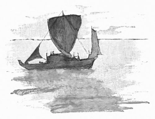 No painter ever saw a more ideal light. And suddenly it faded, leaving us in a still brilliant twilight, through which we looked at the tossing of the hazy sea. The mast was lifted and set, the great square sail was hoisted, and the captain took hold of the ponderous tiller. We stretched ourselves on the poop deck, prepared for a dance of seventeen miles; then under my protecting blanket I fell asleep—to wake and see before me a sheet of rain. The predicted storm had flooded us; we lay in the water that covered the deck, our waterproofs insufficient, and glad to be able to find some protection under the Japanese rain-coats of straw, whose merits I had not yet understood.