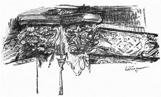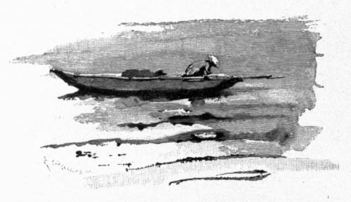 From under my shelter I could see that our mast was lowered, and that the captain and the sailors forward were working at the heavy sweeps. Below, under hatches, I could hear the groaning of our seasick runners. Between the gusts of rain came the voice of the captain, now in the straining agony of seasickness, next keeping up a steady, chanted talk with a mate forward. A lantern was lashed to the post of the tiller, and the captain's bare feet rose and fell with his steps at the great oar, showing sharply the action of tendons and muscles. I tried to sketch under my cover, then dozed,—sleepy with the rocking and [Pg 271] the cold and the wet,—and with every waking hearing the whistling of the wind and the continuous monotonous voice in a language not understood. So passed the night.