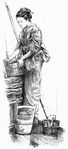 This weary noise marked the intervals of a night of illness, made worse by nightmares of the cholera, from which we were flying. The earliest dawn was made hideous by the unbarring and rolling of the heavy amados,[2] the drawing back of the inside screens (shojis), and the clattering of clogs over pavement, through other parts of the house. Our Japanese family across the way I could hear at their ablutions, and, later, tumultuously departing for early trains; and at last I slept in broad daylight.