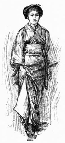 We climbed up the side of the big steamer and found the Doctor there, who told us that he had been expecting us for a whole month; so that he soon took possession of us, and we found ourselves in the hotel launch, and at the wharf, and passing the custom house and its officers, who let everything go through quickly except my suspicious water-color blocks. Outside of the gate, in the street, we found the long-expected jinrikisha, an arrangement that you know probably as well as I do—a two-wheeled perambulator or gig, very small, with a hood that is usually lowered, and with a man in the shafts. Our fellows were in blue-black clothes, a big inscription on their backs; and they wore apron-like vests, close-fitting trousers, and broad straw hats poised on their heads. But you know all about these; and I have only to add that we were trundled off to our hotel, along the pretty quay which edges that part of the town, past European [Pg 4] houses, unlike ours, and having a certain character which will probably appear very commonplace later, because it is not beautiful, but which is novel yet to us. Our hotel is also on the quay, just at a corner where a canal breaks in, and where we can see big walls and trees on the other side. Our rooms open on the water—that same blue water spangled with sunshine and fading into sky. There men-of-war and steamers far out; picturesque junks sailing past rapidly, flattened out into mere edges of shadow and light against the sea and the sky, their great hollow sterns with the rudder far inboard, and sails which are open at the seams. Not far from us was a little sharp-pointed boat with a man fishing, his big round hat as important as any part of the boat. It was already late in the day. European children were out with their Japanese nurses; from time to time a phaeton or a curricle passed with European occupants, and even in this tremendous heat ladies rode out on horseback. But the human beings are not the novelty, not even the Japanese; what is absorbingly new is the light, its whiteness, its silvery milkiness. We have come into it as through an open door after fourteen gray days of the Pacific which ended only at sunrise this very morning. And we looked again at all the light outside, from the dining-room, where we lunched, where the waiters slipped about in black clothes [Pg 7] like those of the runners, and where we were joined at table by a foreign gentleman with high cheek-bones, yellow face, and slanting eyes, and dressed in the latest European fashion with high collar, four-in-hand scarf, and pointed shoes. He was very courteous, and managed what little English he used as skilfully as he dresses. And he gave me a touch of the far East in the story of his being here; for he is under a cloud, an amiable exile whose return to his native land might involve his being boiled in oil, or other ingenious form of death. For well as he figured at luncheon with us, I hear that he has been obliged to leave because of his having poisoned too many of his guests one day at table,—former enemies of his,—and because of his having despatched with the sword those whose digestion had resisted his efforts at conciliation. However this may be, his extradition is demanded; to which he objects, invoking Western ideas of civilization, and protesting that his excesses have been merely political. Then, late in the afternoon, we sauntered out into the Japanese quarter—walking, so that we might mingle with the gray, black, and blue crowd, and respectfully followed by our jinrikisha men, who slowly dragged our carriages behind them, like grooms following their masters. We stopped at little curio shops and bargained over miserable odds and ends, calling up, I feel sure, the unexpressed contempt of the Doctor, the great collector of precious lacquers; but it is so amusing to see things as they are, and not as they should be. We went into a show which had an enormous draped sign outside, and where, in uncertain darkness, an old, miserable, distorted dwarf played the part of a spider in a web, to the accompaniment of fiendish music and the declamation of the showman. Then we lingered outside of a booth in which a wrestling match was going on, but did not enter, and we saw the big wrestlers go in or come out, their shoulders far above [Pg 8] the heads of a smaller race of men, and we turned at every moment to look at the children, many of whom are so pretty, and who seem to have an easy time of it. Men carry them in their arms as women do with us, and many a little elder sister walks about with the infant of the family slung behind her maternal shoulders. And then there are curious combinations of Western and Eastern dress—rarely successful. Our hats and shoes and umbrellas—all made here, are used, and our ugly shirts stiffen out the folds of the soft Japanese robes; but the multitude wear their usual dress and make no abuse of hats.