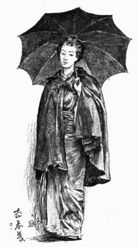 The rain still held off. We entered our kurumas, now ready, and hastened to the main road which we were to find at Numadsu, if that be the name of the place. But, alas! the rain came down, and my views were confined within the outline of an umbrella. My only adventure was stopping at some hovel on the road to buy some more of that heavy yellow oiled paper which replaces the leather apron that we usually find attached to our European carriages. By and by I consented to have the hood of my wagon put up, through which I could see little more than the thatched backs of my runners, their bowls of hats, off which the rain spattered upon their straw cloaks and aprons, and their wet brown legs, lifted with the regularity of automatons. It was getting cold, too, [Pg 274] and women under their umbrellas wore the graceful short overcoat they call haori, and tottered over the wet ground on high wooden pattens.
