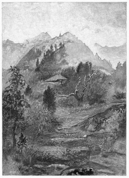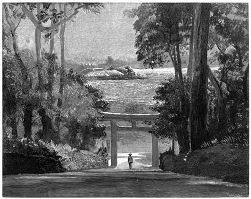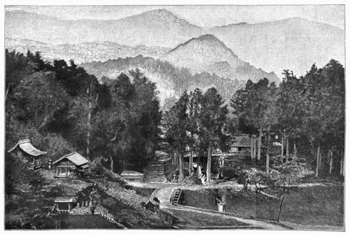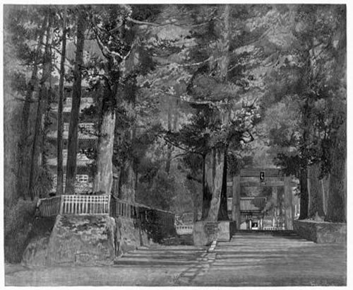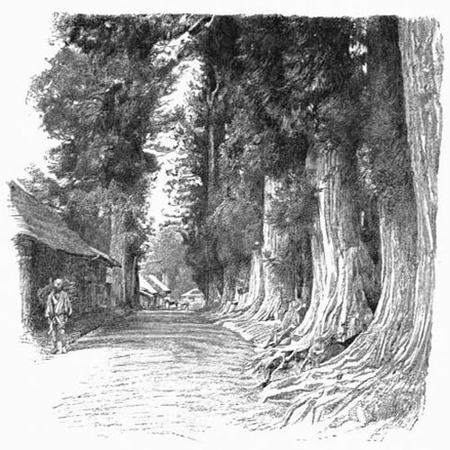Then, leaving the dry and sunny uplands, we entered a famous avenue, shaded for twenty miles by gigantic cryptomeria trees 60 to 120 feet high. They were planted, as an act of homage, some two centuries ago, by some mighty noble, when it was decided to place at Nikko the tomb of the great shogun Iyéyasŭ. They rise on each side of the sunken road, from banks and mounds, over which steps lead, from time to time, to plantations and rice-fields beyond, and to shrines peeping out among the trees. In side-roads above, on either hand, passed occasionally peasants and pack-horses laden with forage, or the bright shine of a peasant woman's red skirt. Where an occasional habitation, or two or three, are niched in some opening, the tall columns of the great trees are interrupted by spaces filled with crossed branches of the wilder pine; and behind these, outside, sometimes the light-green feathery mass of a bamboo grove. Against the bank stood low, thatched buildings; near them the great trees were often down, or sometimes dying; an occasional haystack, sliced off below by use, was fastened, in thick projection, around some smaller tree. Once, at a turn of the road, near a building with wide roof, pushed against the corner bank out of a basin fringed with iris, sprang into the air a little jet of water. Near by, a solitary ditcher had placed in a bamboo fence some bright red blossom, with its stem and leaves, apparently to cheer him at his work.