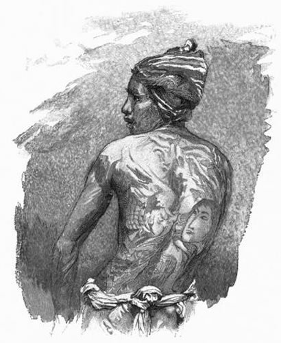 Late in the morning we entered our friend the basha. In the daylight I noticed that the horses wore something like a Dutch collar, and were harnessed with ropes. Two men, one the driver, the other the running groom, sat on the low front seat. Our trunks and bags and Japanese baskets encumbered the omnibus seats, on which we stretched our sick and wearied bodies, for the Doctor himself was ill, and smiled mechanically when I tortured him with questions. We left town at a full gallop, and [Pg 38] at risk of life for every one in the streets; one of our drivers meanwhile blowing wildly through a horn, to the inspiriting of the horses and the frightening of the Japanese small-boy. Soon one of our men plunged off his seat and began running by the horses in the old Japanese way—hereditary with him, for they follow the calling from generation to generation. Running without pause and without sweating, he threw his body back as if restraining his pace to that of the horses. At the limits of the town, in full run, he stripped his upper garments and showed himself tattooed at every visible point. Above the double strip of his breech-clout, a waterfall, a dragon, and a noble hero made a fine network of blue and pink on the moving muscles.