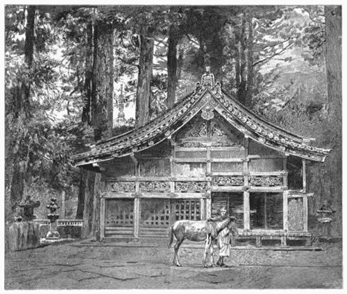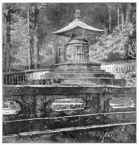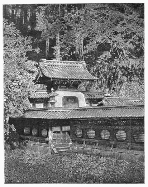 From where we are in the Holy Mountain, our first visit would be naturally to the shrine of the shogun Iyéyasŭ, whose extreme walls I see among the highest trees whenever I look from our balcony over our little waterfall.