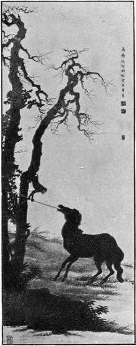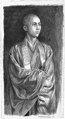 In the first street where the tramway runs there are semi-European façades to houses, and in their pilasters the Ionic capital has at length made the circle of the world. Then we took more Oriental and narrower streets, through the quarter of the gei-sha, the dancers and singers who go out perpetually to put a finishing touch on entertainments. At such early hours they are of course unseen. Where houses seemed more closed than usual servants were attending to household duties, and we heard the occasional strum of a guitar. Then great streets again, with innumerable low houses, the usual shops, like [Pg 13] open sheds, with swinging signs carved, painted, and gilded, or with draperies of black cloth marked with white characters. Merchants sat on their mats among the crowded goods, girls at corners drew water from the wells; in a narrower street the black streak of a file of bulls peacefully dragging merchandise; where the crowd was thickest a black-lacquered palanquin, all closed, in which was shut some obstinate adherent to ancient fashions. Then bridges and canals, and great empty spaces, long white walls with black copings, and buildings that continued the walls, with gratings like those of barracks. These were the yashikis—inclosed residences of princes who were formerly obliged to spend part of the year at the seat of government with small armies of retainers. Then the walls of the castle, great sloping ramparts of irregular blocks of masonry, about which stand strangely twisted pine-trees, while the great moats of clouded water are almost filled with the big leaves of the lotus. Now and then great gates of gray wood and enormous doors. On some of the wide avenues we met cavalry officers in European costume, correct in style, most of the younger with straggling mustaches, long and thin, whence their nickname of "horn-pouts," naturally connected with that of the "cats," devourers of fish, as the gei-sha are called. Near official buildings we saw a great deal of black frock-coats, and trousers, and spectacles. Everything was seen at a full run, our runners dragging us at horse's pace. Still it was long before we reached our destination. Streets succeeded streets, empty or full, in desolate Oriental wearisomeness. At length we stopped at a little gate in a plank fence, and entered a vast high space, formerly a prince's park, at one end of which we saw trees and hills, and we came to the Professor's house, a little European structure. My mind is yet too confused with many impressions to tell you of what we saw that afternoon[Pg 14] and evening, and what was said; all the more that the few beautiful paintings we looked at out of the great collection lifted me away from to-day into an indefinite great past. I dislike to use analogies, but before these ancient religious paintings of Buddhist divinities, symbolical of the elements or of protective powers, whose worn surfaces contained marvels of passionate delicacy and care framed in noble lines, I could not help the recall of what I had once felt at the first sight of old Italian art.