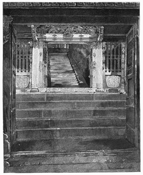 On the curve of the beach before it stood a high pointed rock almost touched by the water, edged around and covered with pines—all but the perpendicular side facing the harbor. On its summit stood a little red temple, whose back we saw. On the other side, landwards, as we left our boat and followed our guides ashore around its base, a hundred steps ran straight up to the front of the little shrine—so steep and sudden that we could just look along their edge. From the high rock, recessed, ran back the shore, on which stood in a row three large junks [Pg 272] with their sterns to the sea—behind them trees and houses. On the opposite side of the little harbor four of our men, up to their middle or up to their armpits in water, slowly dragged our junk nearer to the shore. All was quiet and gray—the men reflected in the moving water, the boat creaking along slowly. As I went up the beach, following our guide and the boatmen, I thought how like this was to the Homeric haven—the grove looking out to sea and frequented by "fowls maritimal"; the sacred rock; the meadows and the little stream; the long galleys drawn up on the beach. The little houses of the fishing-village were surrounded by gardens, and their walls largely made of plaited bamboo. There was no inn, but we found a house half shop, and were welcomed to some tea and to a room which the family hastened to abandon for us. There were only two rooms besides the entrance, which was a large passage floored with earth, and along one side of it a raised surface, from which began the level of our flooring.