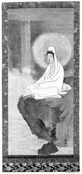Again the kago, and the rain as soon as we departed. I turned as well as I could, to find the lovely lines, now lost in general shapes and values, blurred into masses. Once the light opened on the top of some high hill, and I could see, with wild roses right against me, some flat milestone marked with an image against the edges of distant mountains, and a sky of faint twilight pink; or again we pattered along in wet grass, past a great rock with a great bas-relief image—a Jizo (patron of travelers) sitting in the loneliness with a few flowers before him. Then in the rain, and mingling with the mist, thicker cloudings marked the steam from hot springs, which make these parts of the mountains a resort for invalids and bathers.