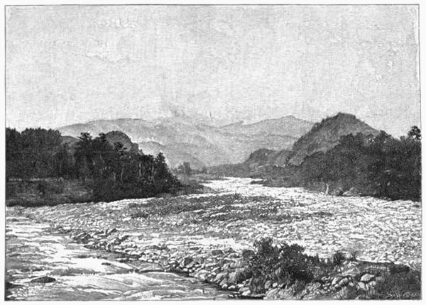 Right into this marvelous picture we rode, through green plantations and rice-fields, which edged the bases of the nearest hills and lay between us and the river. There we found no means of crossing. All bridges had been carried away by the flood. The plain was inundated; travelers had been detained for a week by a sea of waters, and were scattered there and in neighboring villages, filling every resting-place; and, worst of all, the police officials would not allow us to tempt the fishermen to make the dangerous crossing.