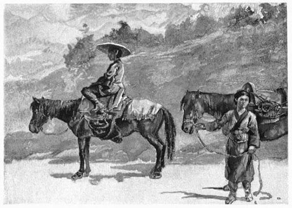 Into the kagos we were folded, and in a torrent of rain we departed. I resisted my being shut up in my litter by the oiled-paper sides that are used in the rain, and I depended upon mackintosh and blanket to protect me. The rain came down in sheets. We trotted uphill, the men going on for a few minutes, then changing shoulders, and then again another pair taking their turn—four to each litter. Meanwhile they sang, as they trotted, something which sounded like "Hey, hey, hey, het tue hey." The road was almost all paved, and in the steeper ascents was very bad.
