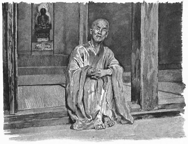 Then, as we were about leaving, we solemnly placed a great ornamental revolver before the little god of Contentment who sits upon the Tokonoma—that mantelpiece which is at the level of my eye when I lie on the floor, and which is the Japanese ideal seat of honor, but never occupied. This revolver is left there to appease a Japanese conventional fear of robbers. We went down in the twilight to our friends, and had a very European supper, and sat on their veranda, looking through the trees toward the bridge, in a moonlight of mother-of-pearl; and we were so sleepy that I can only suppose we must have talked of home, and I can only remember our host clapping his hands for lanterns, and Kato leading us back, with the light held low, and the noise of the torrents running under the little stone bridges that we passed, and our taking off our shoes on our own door-step, and the thunder of the amado as Kato rolled them out for the night.
