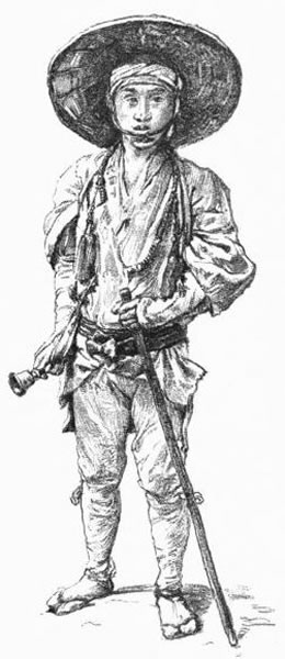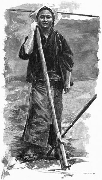 [7] "Pariahs. Their occupations were to slaughter animals, tan leather, attend at executions, etc. The class, as such, is now abolished, but remnants of its peculiar dress may still occasionally be seen in the persons of young girls with broad hats who go about the streets playing and singing." (Satow).