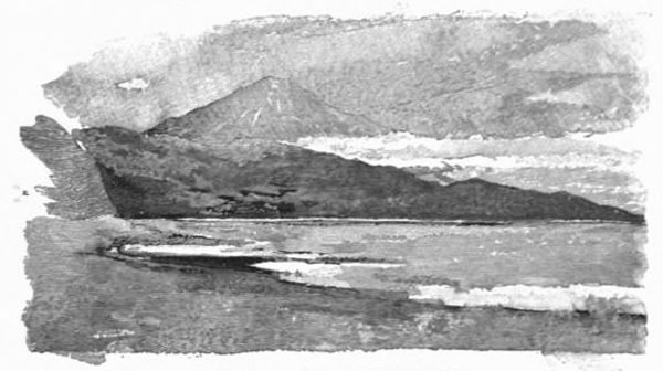 We saw the morning break on a lonely, high, gray bank, streaked by the sea lines of different tides, and crowned with a line of pines of all sizes and shapes, stretching for miles dark green against the white clouds which covered the base of the mountains behind. Out of these white banks stood dull blue peaks, while the highest mountains were lost in cloud, and all was gray and desolate with the rain. The surf broke on the sand not more than a hundred yards from us. We lay there some time, waiting for more light, for all wind had ceased; then four men swam ashore with a rope, and towed us along the bank. The surf had abated, but landing was too difficult, and we were to be dragged, while our other men worked at the big sculls and pushed us along. We wore along four miles to a little bar, over which we were pulled by the men now in the water into a singular little harbor with an entrance not more than a hundred feet wide. On this the surf broke gently—white on the gray sea. To our left the backs of two sand-spits dotted the water, and on the right, looking out to sea, rose the edge of a grove of pines, with four or five houses, heavy roofed and thatched, against its green darkness.