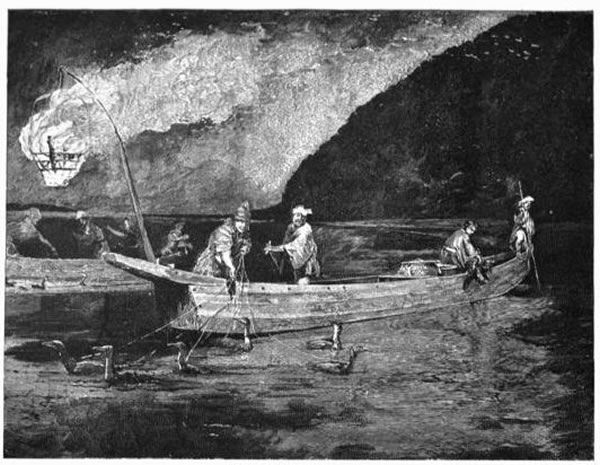Then the birds began to fight, and to show that peace was not their pleasure. Fresh pine knots were thrown into the cressets; each man took his place; the polers pushed off; the birds strained at the strings; and all da capo. A little longer we watched, and then we let the [Pg 264] boats glide past us; the fires faded again into a haze of light as they went down the river toward the bridges of the town, now dotted with people.