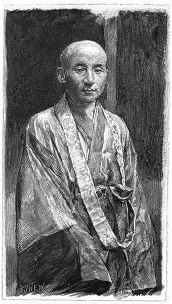 These great posts under the bridge lean against what seems the wall of the mountain; the rock foundation being supplemented, everywhere that a break occurs, by artificial [Pg 49] work. Here and there cascades fall over natural and over artificial walls and glisten far up through the trees on the opposite side of the bridge. As we rattled over it, we looked down on the overflowing long wooden trough, which carried the pure waters of the mountain to the village that we had passed, and upon the torrent below, whose limpid clearness was made blue by mist, where the warmer air was chilled by a coldness drawn from far-up mountains. Before us steps of enormous width passed under the foliage and turned above in many directions, and there on the lowest step, her dainty feet on straw sandals, whose straps divided the toes of the close-fitting Japanese socks, with bare ankles, stood our hostess, in latest European dress, most graceful contrast to our own consciousness of being jaded and dirty, and to the nakedness of our runners. Panting with the last run, they stood at rest, and leaned forward against the cross-bar of the shafts, with muscles still trembling, clear streams of sweat varnishing their bronze nakedness, and every hair plastered with wet on forehead, chest, and body. Just before them rustled the unrumpled starched spread of the skirts of the fair American. She was summering at Nikko, and, friendly with the Buddhist clergy, had arranged that one of the priests should let us have his house, and kindly walked with us to it, a little way up in one of the first open spaces of the mountain. After passing the great outside fringe of trees we found a large clear opening, broken up by walled inclosures, the wall sometimes high and sometimes low, and edged by gutters through which the torrents ran. These were the former residences of princes, whom etiquette obliged to worship officially at Nikko. A quarter of a mile up we came to our own garden,—with an enormous wide wall or embankment of stone, some twenty feet deep,—which also had been a prince's, and now belongs to the little Buddhist priest who is our landlord. There[Pg 50] are two houses in the inclosure, one of which he lets to us. Ours is brand-new and two stories high, while his is old and low, with an enormous roof, and an arbor built out from the eaves and connecting with his little garden. High behind his house rise rocks and wall; and on top of them are planted willows, pines, maples, and the paulownia, whose broad leaves are part of the imperial crest. A little waterfall tumbles over the rocks and gives us water for our garden and for our bath. In our house we made the acquaintance of Kato, who is to wait upon us. A few minutes later we were welcomed by our landlord, dressed for the occasion. He conducted us to our rooms, and, leaving for a moment, returned with a china bowl that was covered with a napkin, and contained sweetmeats which he told me are peculiar to Nikko.