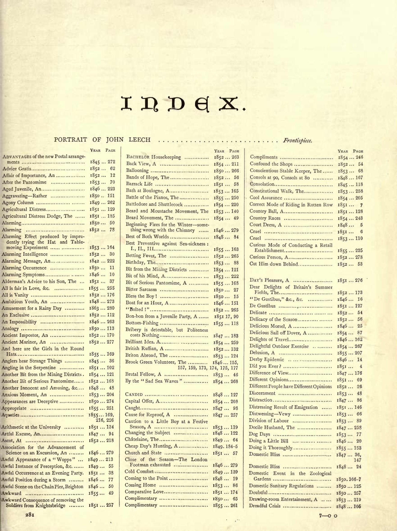 Advantages of the new Postal arrangements .............1845...272 Advice Gratis .........................................1852...062 Affair of Importance, An ..............................1852...012 After the Pantomime ...................................1853...070 Aged Juvenile, An .....................................1846...223 Aggravating—Rather ...................................1850...151 Agony Column ..........................................1848...262 Agricultural Distress..................................1851...129 Agricultural Distress Dodge, The ......................1851...195 Alarming...............................................1850...050 Alarming ..............................................1858...078 Alarming Effect of the Hat and Table-moving Experiment.1853...184 Alarming Intelligence .................................1852...030 Alarming Message, An...................................1842...222 Alarming Occurrence ...................................1850...011 Alarming Symptoms......................................1846...010 Alderman's Advice to his Son, The .....................1851...037 All is fair in Love, &c................................1855...255 All is Vanity .........................................1852...176 Ambitious Youth, An ...................................1848...273 Amusement for a Rainy Day .............................1863...280 An Exclusive...........................................1852...112 An Impossibility ......................................1846...263 Analogy................................................1850...113 Aucicnt Impostor, An...................................1852...170 Ancient Mariner, An ...................................1852...277 And here are the Girls in the Round Flats..............1855...169 Anglers hear Strange Things ...........................1845...036 Angling in the Serpentine .............................1851...102 Another Bit from the Mining Districts .................1854...121 Another Bit of Serious Pantomime.......................1852...163 Another Innocent and Amusing, &c.......................1848...048 Anxious Moment, An ....................................1853...204 Appearances are Deceptive..............................1850...274 Appropriate ...........................................1855...251 Aquatics...............................................1855...169 ...216 ...226 Arithmetic at the University ..........................1851...134 Artful Excuse, An......................................1847...094 Ascot, At .............................................1852...218 Association for the Advancement of Science , An .......1846...279 Awful Appearance of a "Wopps" .........................1849...213 Awful Instance of Perception, &c.......................1849...055 Awful Occurrence at an Evening Party...................1851...038 Awful Position during a Storm .........................1846...077 Awful Scene on the Chain Pier, Brighton................1846...050 Awkward ...............................................1855...049 Awkward Consequence of removing the Soldiers ..........1851...257