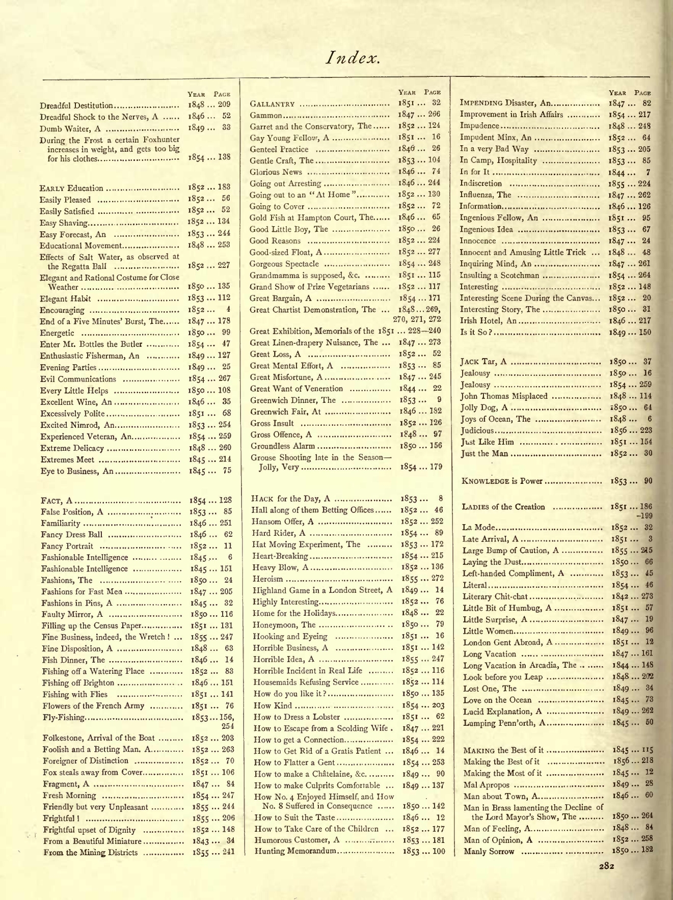 Impending Disaster, An.................................1847...082 Improvement in Irish Affairs ..........................1854...217 Impudence..............................................1848...243 Impudent Minx. An......................................1852...084 In a very Pad Way .....................................1853...205 In Camp, Hospitality ..................................1853...085 In for It..............................................1844...007 Indiscretion ..........................................1855...224 Influenza, The ........................................1847...262 Information............................................1846...126 Ingenious Fellow, An ..................................1851...095 Ingenious Idea ........................................1853...067 Innocence .............................................1847...024 Innocent and Amusing Little Trick .....................1848...043 Inquiring Mind, An.....................................1847...261 Insulting a Scotchman..................................1854...264 Interesting ...........................................1852...148 Interesting Scene During the Canvas....................1852...020 Interesting Story, The.................................1850...031 Irish Hotel, An........................................1846...217 Is it So?..............................................1849...150