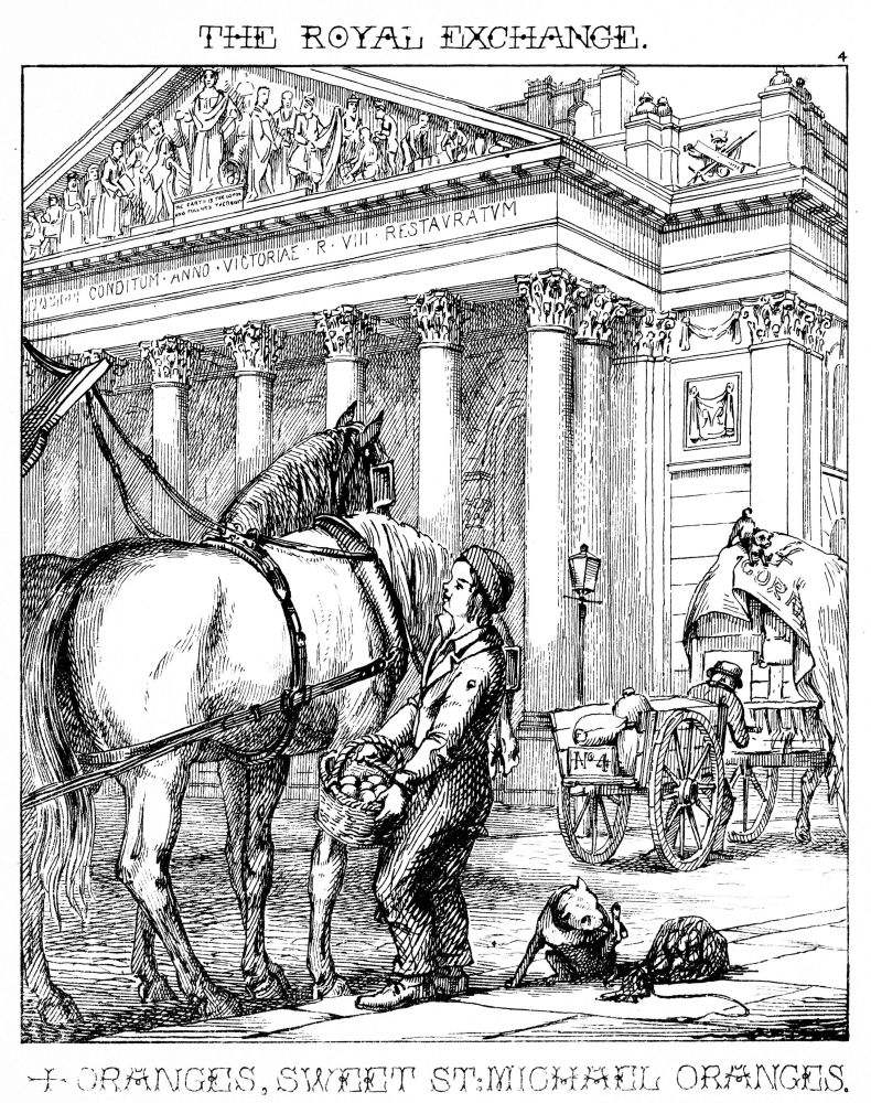 Here is a poor Irish boy endeavouring to dispose of his oranges to some passengers outside an omnibus, in Cornhill, near the