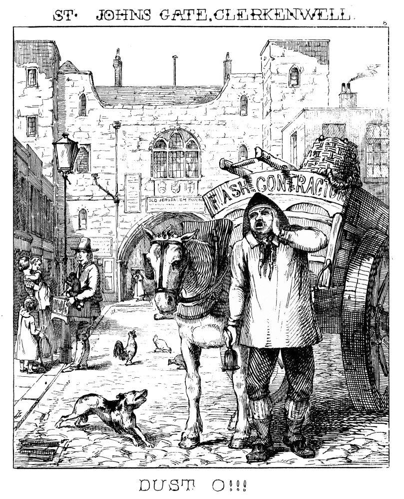 The costume of the Dustman bears a strong resemblance to that of the coalheaver, who appears to be of the same family, probably through their both being connected with the same material, the one before it is burnt, the other after. They formerly rang a bell to intimate their approach, but made so much noise therewith, as to cause the legislature to interfere, prohibiting its use.