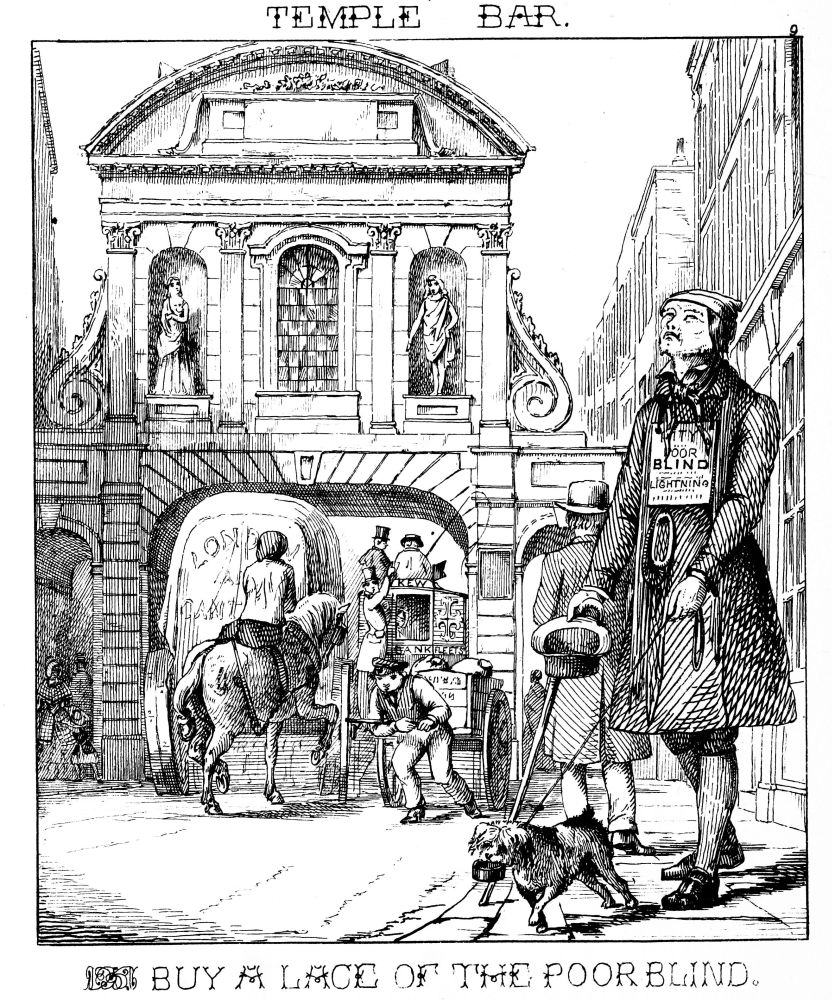 The blind must gain a livelihood, as well as those who are blest with sight; but, alas! how few are the arts which can be performed by one so bereft: hence the necessity of an appeal to the benevolent—“Pity the poor blind!” He sells cabbage-nets, kettle-holders, or laces, doubtless the work of his own hands in the evenings, which we term “blindman’s holiday.”—We are proceeding along Fleet Street, soon to pass under