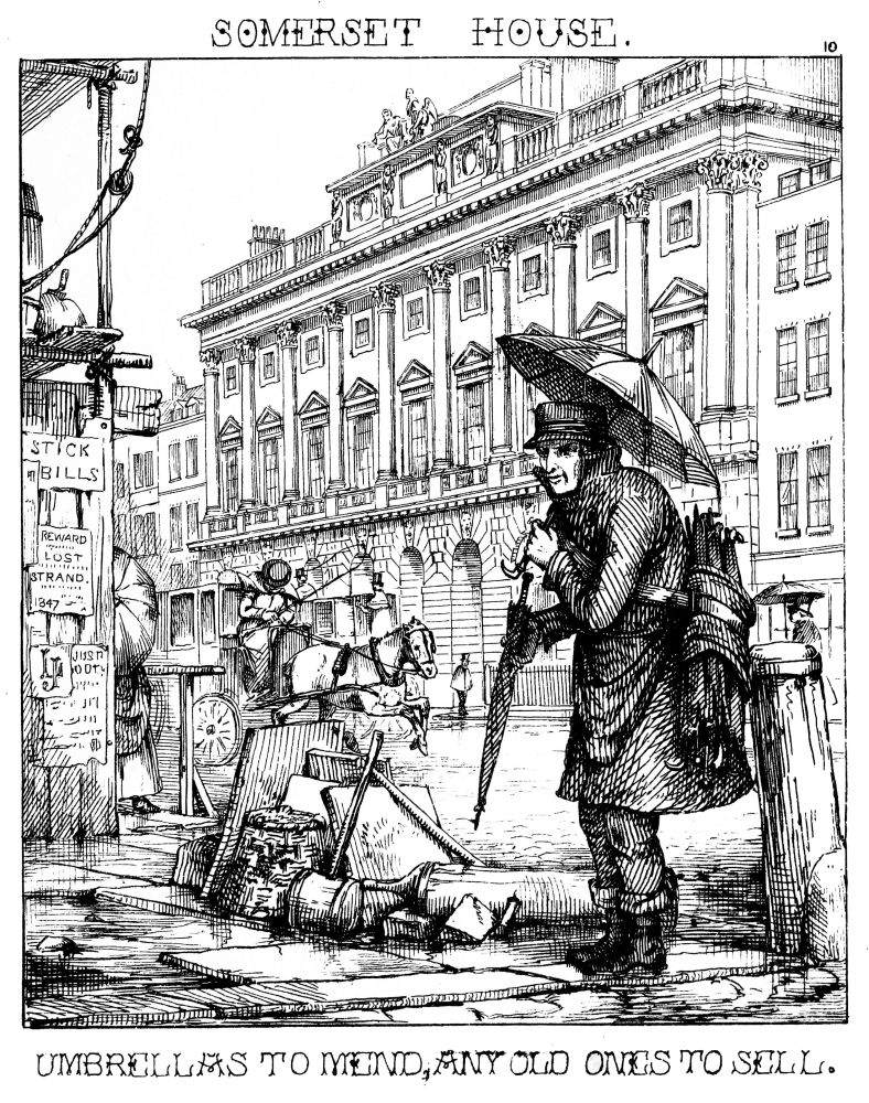 During the day the Umbrella-mender goes his rounds, repeating these words, “Umbrellas to mend! Sixpence apiece for your old broken umbrellas!” and, having collected enough, he returns home to patch and mend, after which he or some of his family hawks them about for sale. Here he appears in his glory, under the auspices of St. Swithen, the patron saint of umbrella and patten-maker. It is the Strand, near