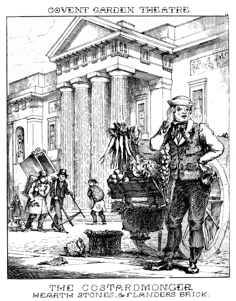 (so called from an apple of that name) is an itinerant vendor of garden stuff. He mostly transports his vegetable wares in a cart drawn by a donkey. His cry varies with the seasons and their produce: at one time we have “Cabbage plants,” “New potatoes,” or “Asparagus;” at another, “Fine young peas, fresh gathered,” “Ripe rhubarb,” “Baking or boiling apples:” he is now calling “Gooseberries! fourpence an ale-house quart, gooseberries!” In the background is a seller of